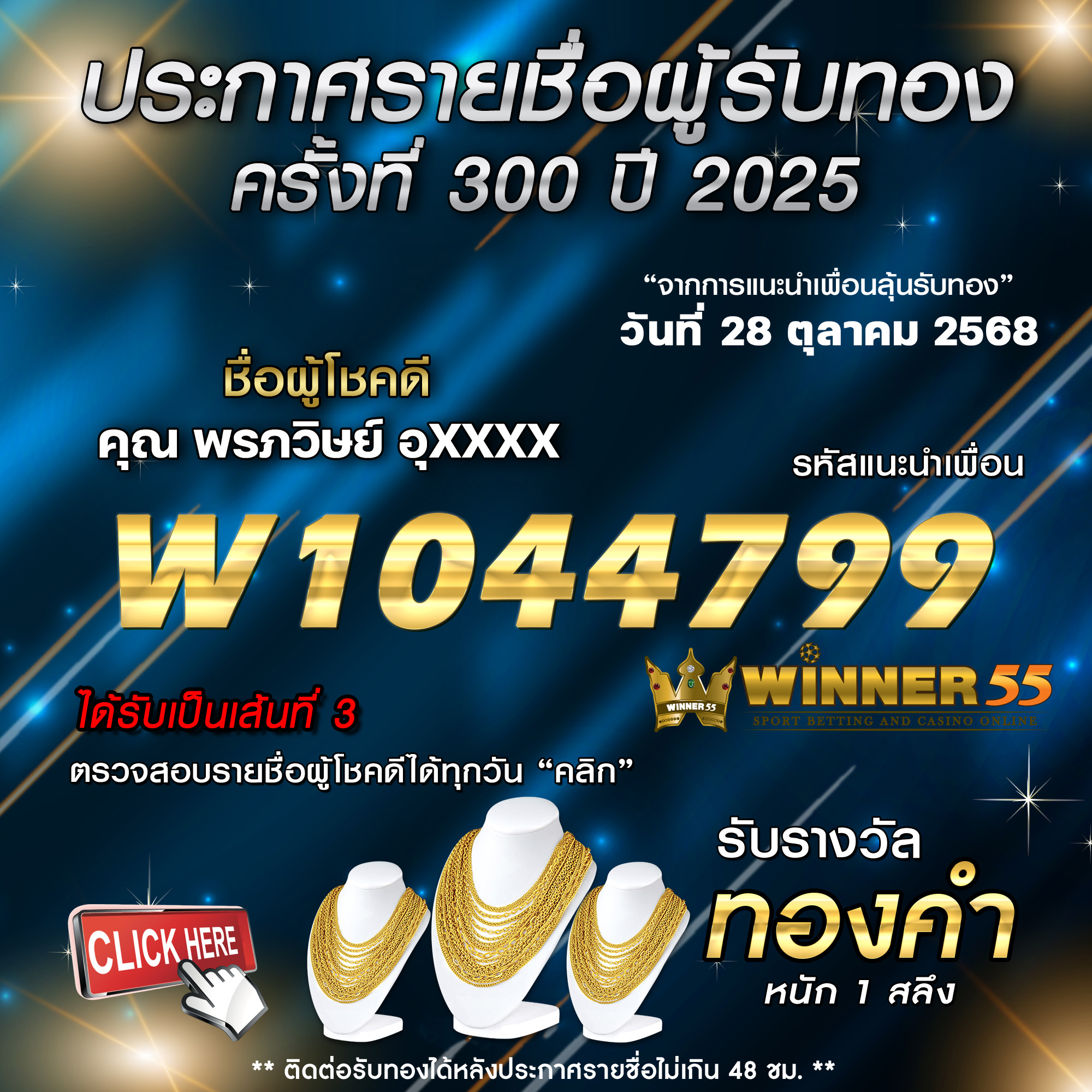 ประกาศรายชื่อผู้โชคดี พรภวิษย์ อุxxxx ได้รับทองคำหนัก 1 สลึง ประจำวันที่ 28 ตุลาคม 2568