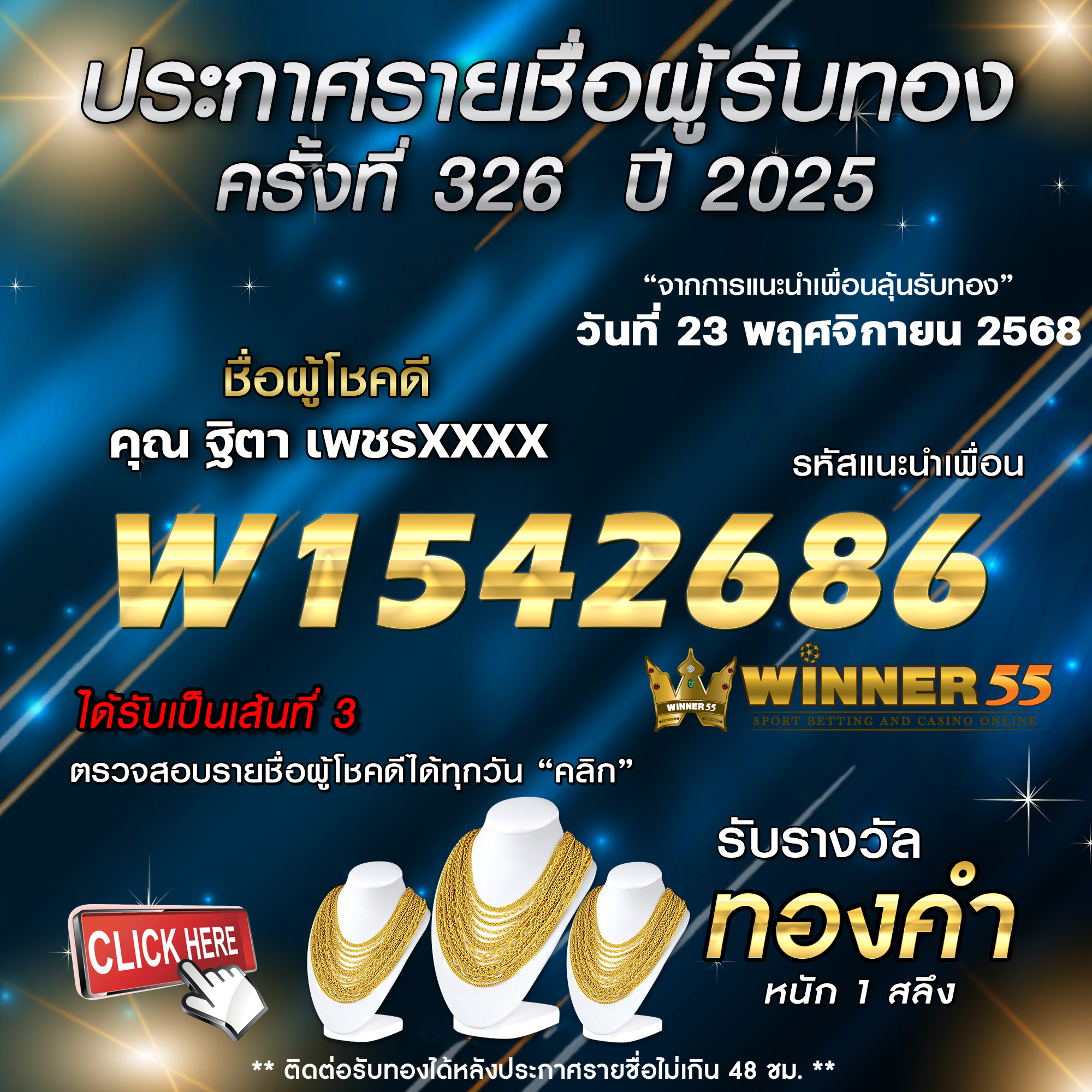 ประกาศรายชื่อผู้โชคดี ฐิตา เพชรxxxx ได้รับทองคำหนัก 1 สลึง ประจำวันที่ 23 พฤศจิกายน 2568 23/11/2025